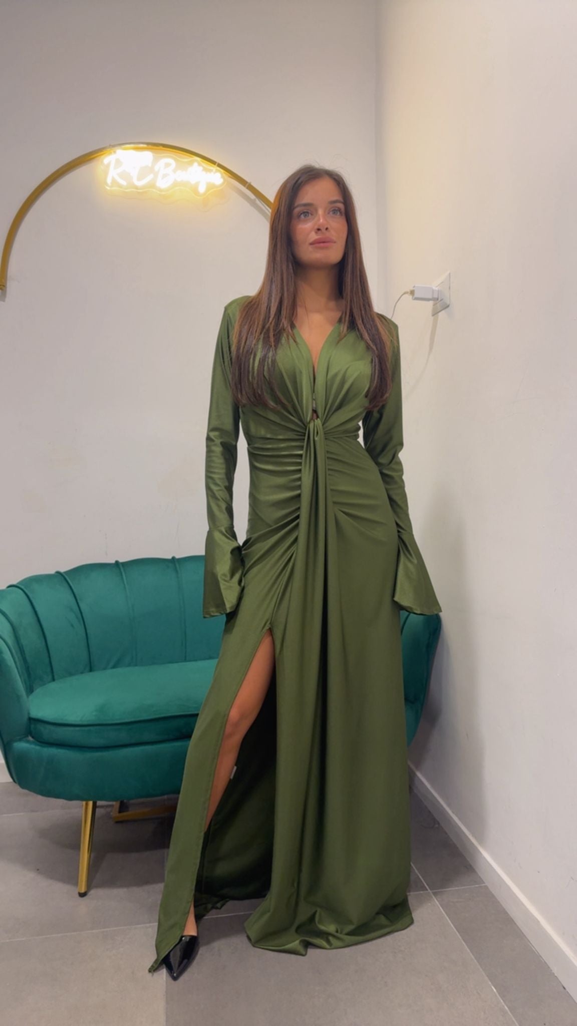 Abito lungo con scollo profondo a V e spacco laterale , taglia unica.
